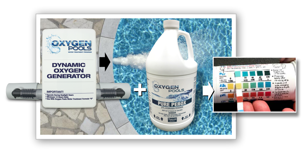 Simultaneously, our patented high velocity generating system creates a safe residual level of hydrogen peroxide in the water supplemented by a maintenence dose of Pure Perox.Levels are easily tested using Oxygen test strips